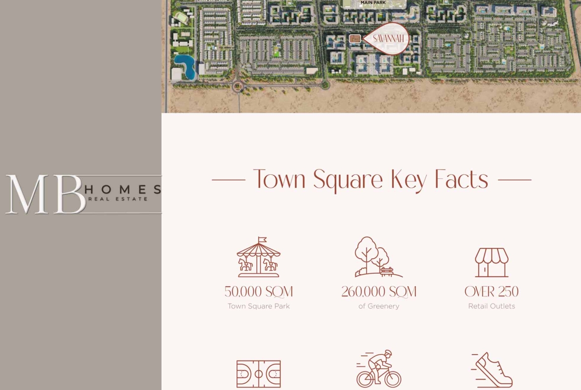 Savannah is part of the larger Town Square Dubai, which includes Central Park, a serene space for relaxation and community gatherings.